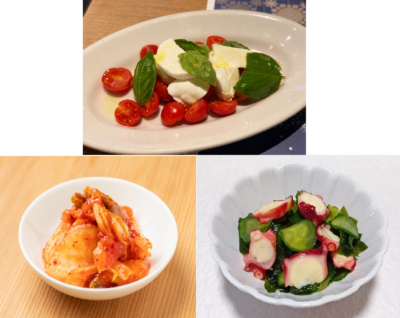 こちらは前菜の盛り合わせの参考例です。和洋中で食べ合わせが悪いかもしれませんが、栄養価は◎なので許してください。タコときゅうりの酢のもの→カプレーゼ→キムチの順なら食べられなくはないでしょう。お酢の『酢酸』、オリーブオイルの『オレイン酸』、発酵食品の『酵素』…体に良いポイントを上げるときりがない3品の盛り合わせです。
