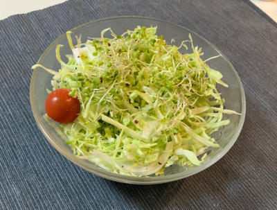 エキストラバージンオリーブオイル、岩塩、コショウ、リンゴ酢(大さじ1)をかけて食べています。このサラダのポイントは『リンゴ酢』。お酢に含まれる『酢酸』が血糖値の上昇を約30%抑えてくれます。食物繊維と酢酸のダブル効果で食後の血糖値が緩やかに上がるので優秀なべジスターターと言えるでしょう。