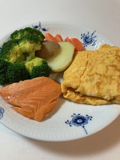 こちらは私の朝食。毎朝決まって同じものを食べています。もちろん、野菜から。「いろんな食材を食べてください。」と言っておきながら同じものを食べてすみません(-_-)栄養バランスは夕食で調整しています…